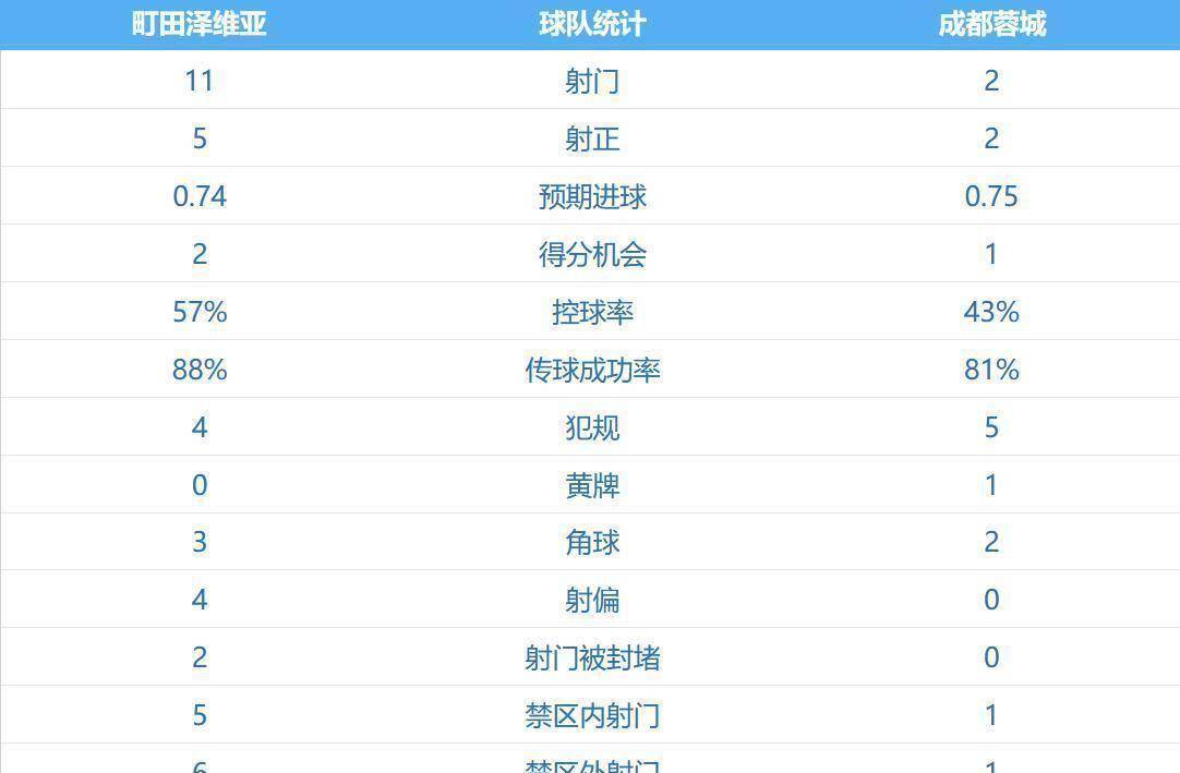比赛进入伤停补时阶段,第90分钟,替补登场的廖荣祥送出传中,外援费利佩禁区内力压对方后卫头球破门,将比分扳为2比3。 但时间所剩无几,成都蓉城最终未能创造奇迹,以2比3的比分遗憾落败。 全场比赛的数据统计显示,成都蓉城在控球率上只有43%,明显落后于对手。射门次数上,成都蓉城仅有2次射正,而町田泽维亚有5次射正;总射门次数更是2比11的巨大差距。