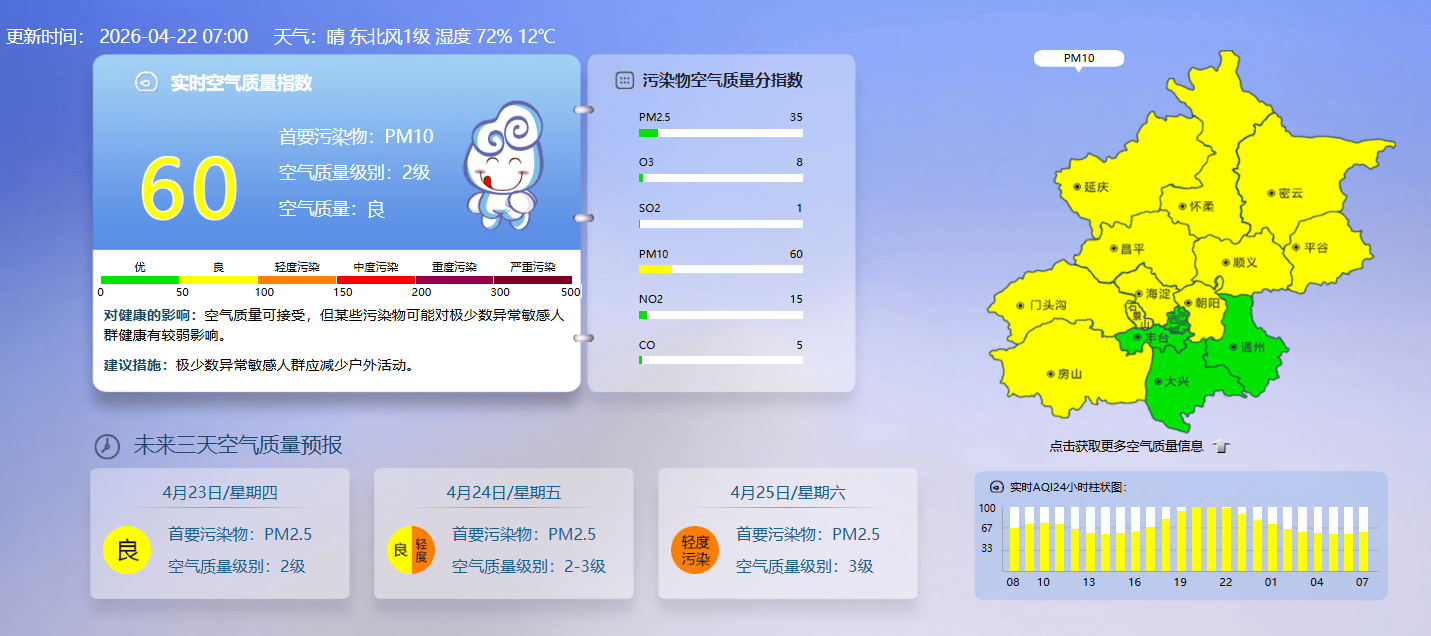 据北京市生态环境监测中心今早7时数据,目前实时空气质量指数60,空气质量良。