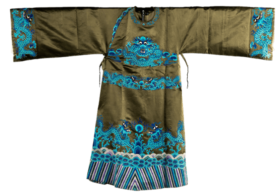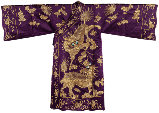 周信芳在武戏上转益多师,汲取南北各派的养分,如杨小楼、李春来、尚和玉、李吉瑞、杨瑞亭和黄(月山)派中的马德成等,特别从黄派学习了《八蜡庙》《剑峰山》《溪皇庄》等许多白胡子武生戏,受到广大观众的欢迎。这件开氅是周信芳演武戏时常用的一件,是用大量金线绣的两只麒麟占据主体,麒麟正是周信芳的标志性纹样。