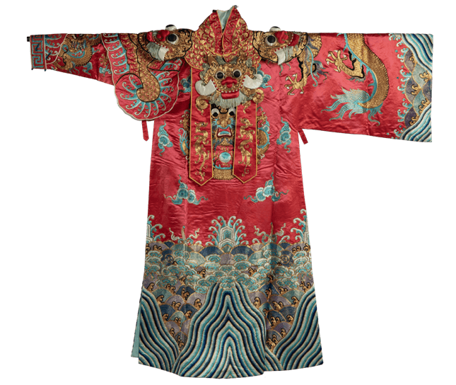 1940年,周信芳为鼓舞民族士气,编写《文天祥》,创制了这身“文武袖”。左袖为宽大的蟒袖,右袖为紧口的靠袖。在红蟒中加入戎装的元素,从而突出文天祥文韬武略的英雄形象。