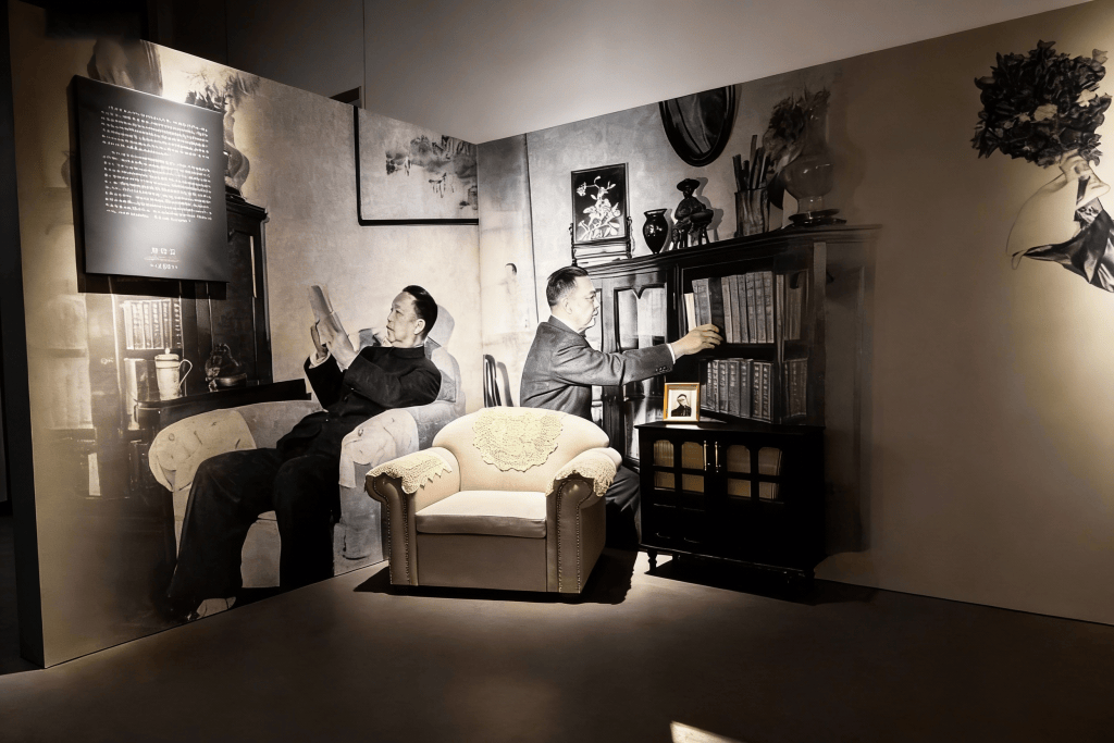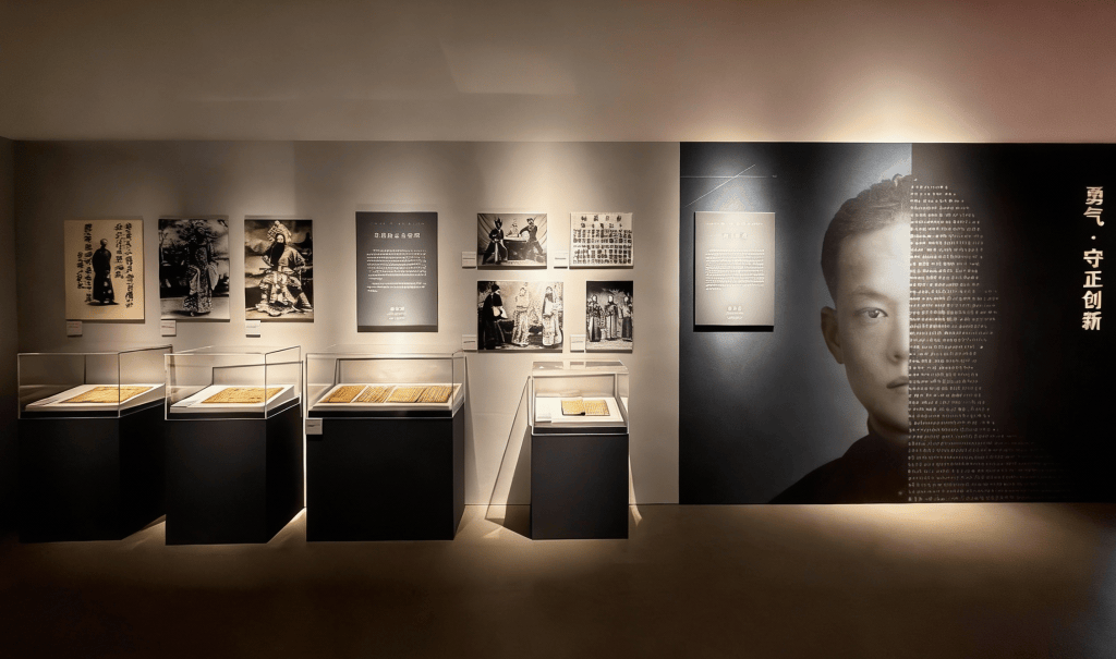 由于言子书院的参观者有大量学生群体与家庭受众,展览的策展与设计也力求走近当代年轻群体。上海京剧院与上海视觉艺术学院师生团队合作,将传统戏曲元素与现代设计语言相结合,视觉艺术学院人工智能应用工作室运用AIGC技术手段,使老照片焕发新生,为展览注入时代气息。展览互动区域也力求生动体验,观众可以通过扫码拍摄获得一张与周大师跨越时空的“合影”。