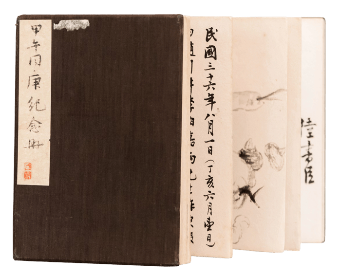 本册是甲午同庚会活动的签到本,记载了自1943年起该会十二次聚会活动的情况,由周信芳保存。册中除了与会人员的亲笔签字外,还有郑午昌、吴湖帆、汪亚尘等大画家合绘之画稿,具有很高的历史和艺术价值。