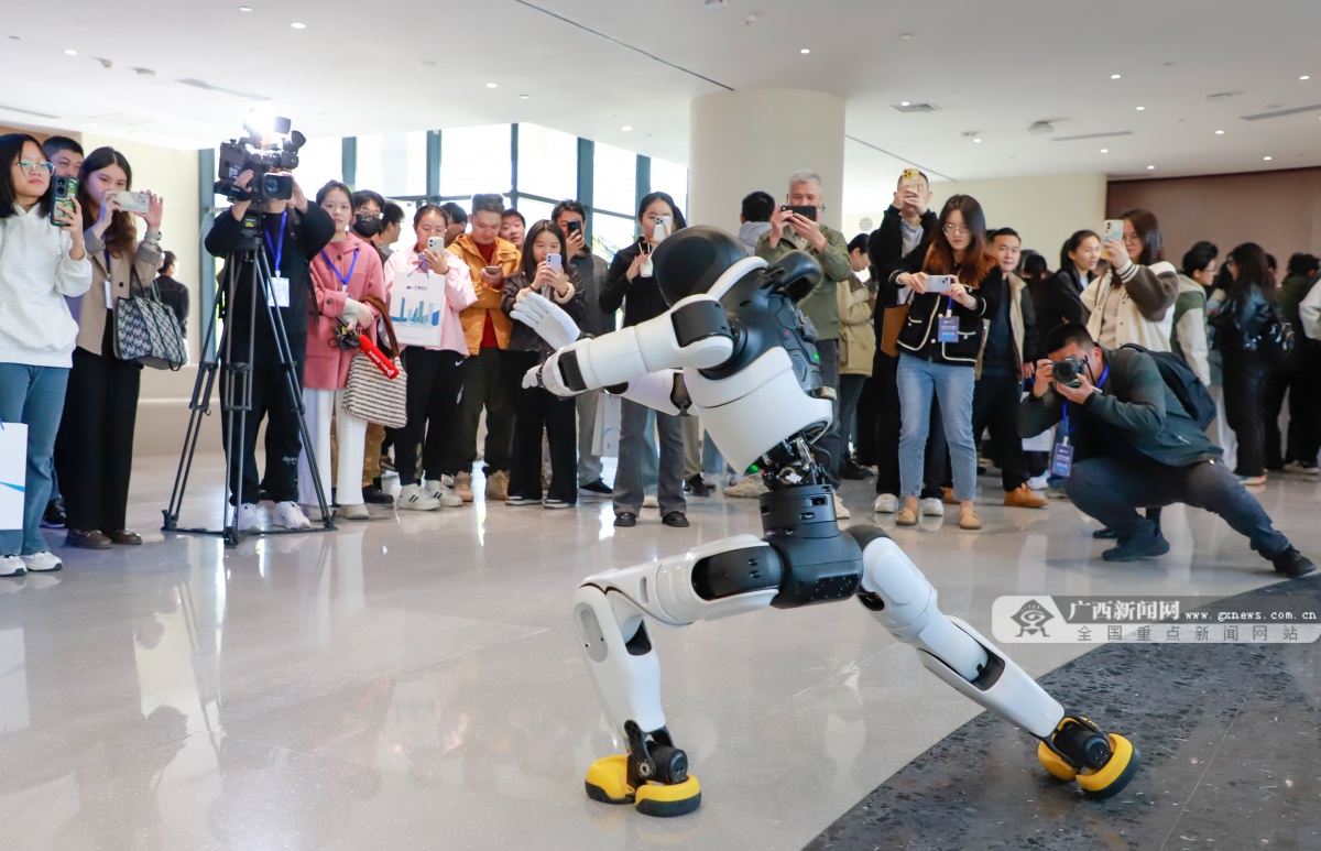“才聚五象 智绘未来”主题活动现场,白色人形机器人抬臂扭腰,随节奏灵活舞动,不时与观众挥手互动,灵动身姿引得现场赞美声不断。南宁五象新区供图