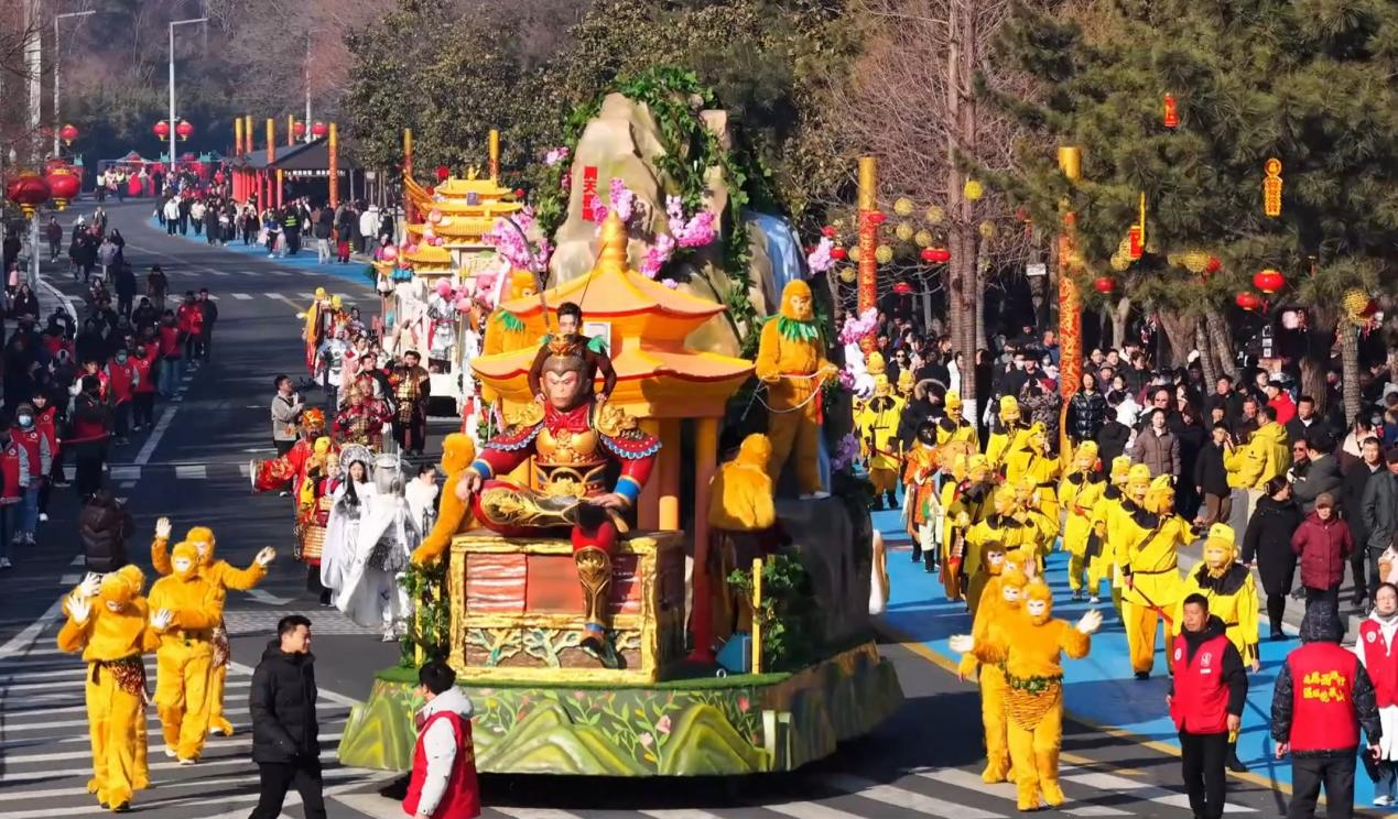西游主题巡游队伍穿行其中,师徒四人、各路仙友驾着炫彩花车穿梭于景区,沿途与游客热情互动,给游客们送去最诚挚的新年祝福。游客们纷纷拿出手机拍照打卡,兴奋地挥手呼喊,争相与“美猴王”同框合影,记录下最鲜活的春节记忆。“这场花车巡游真是太精彩了,《西游记》中的人物展现在眼前,仿佛一秒穿越进书里,年味和童年记忆一起回来了。”来自南京的游客张女士举着手机,一边拍照一边笑着说道。
