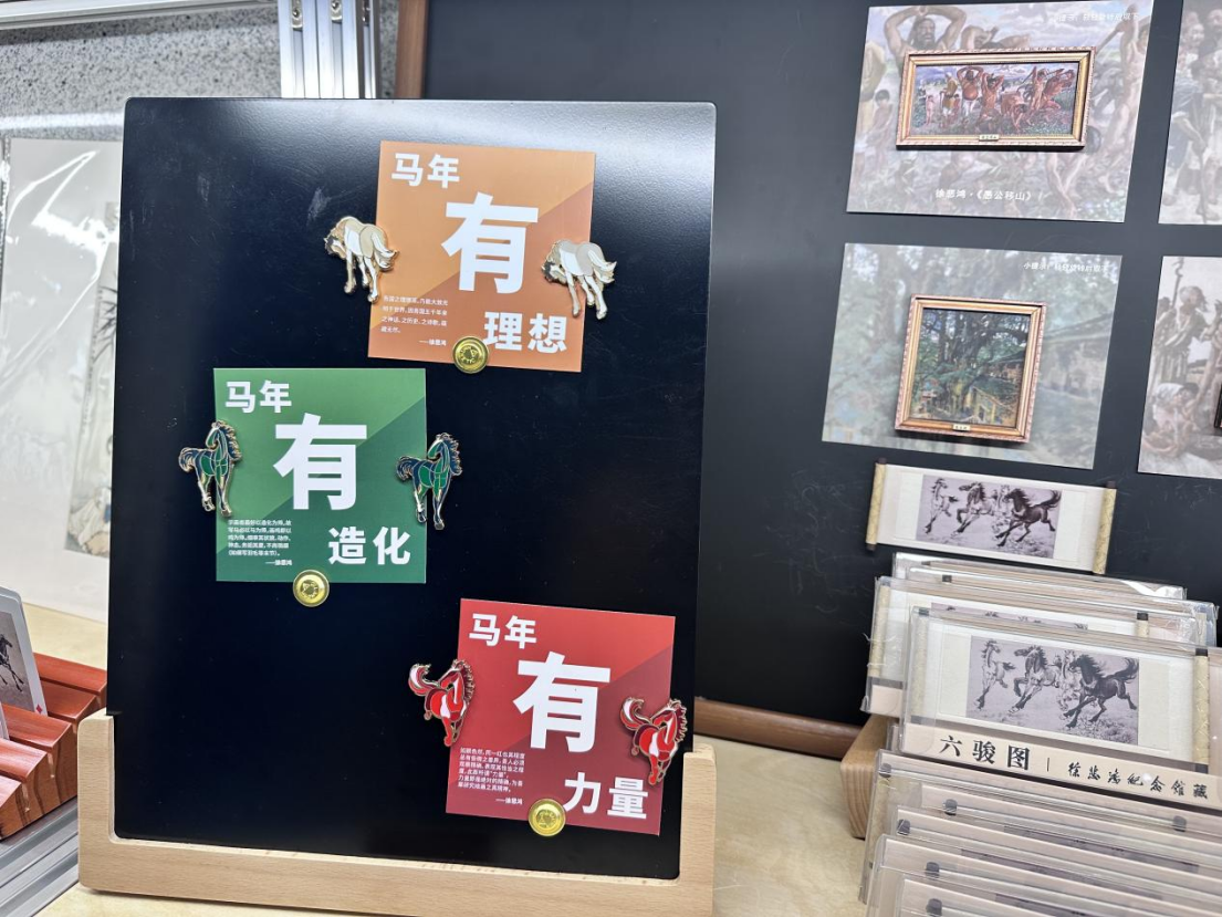 明信片、冰箱贴、纪念徽章组成的“文创三剑客”,成为观众打卡纪念馆后,传递祝福、留存纪念的首选伴手礼。来自河北保定的一名观众选择了红色的奔马徽章作为纪念,“我选‘马年有力量’的徽章,希望新的一年能量满满,马力十足、奋勇向前。”几位年长者在不同风格的文创前犹豫不决,其中一位笑着说道:“要金属徽章样式的,既能当冰箱贴也能随身佩戴,讨个‘马到成功’的好彩头。”展区内,不时传来这样的轻声交流,每一件精心挑选的文创,都寄托着大家对马年的美好祝福。