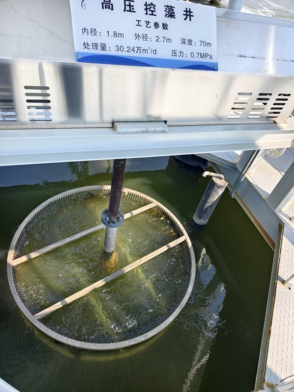 试验中的高压控藻装置,以70米高差产生压强粉碎藻体,从而达到清洁水体的目标。这种新装置的费用只有现行方案三分之一左右,从去年11月开始投入使用,为进一步治污提供了新选择。