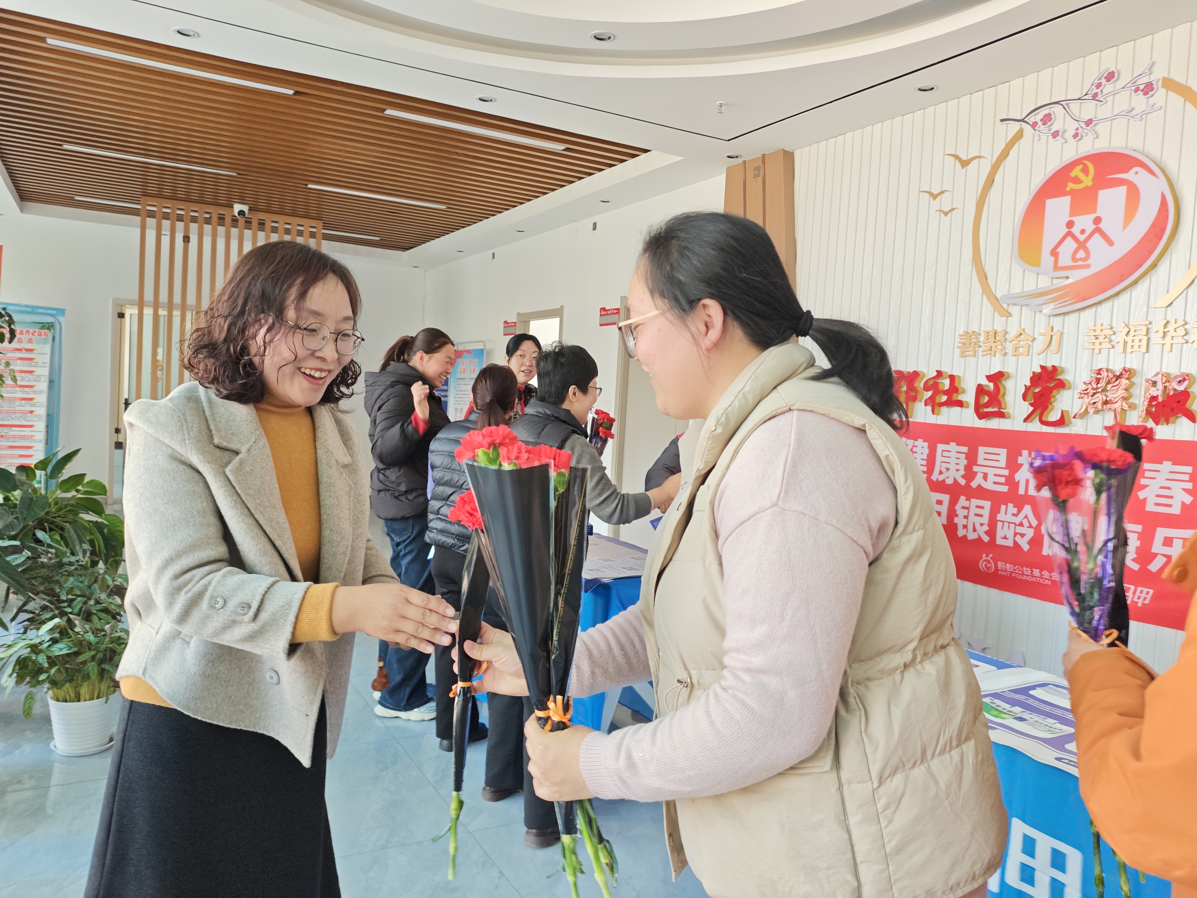 活动最后,社区工作人员和志愿者们手捧一朵朵娇艳欲滴的康乃馨,向参与活动女性居民、社区巾帼志愿者以及坚守岗位的女性工作者们送上节日的问候。一句句“节日快乐”“您辛苦了”的暖心话语,搭配着象征爱与关怀的康乃馨,让大家脸上洋溢起幸福的笑容。