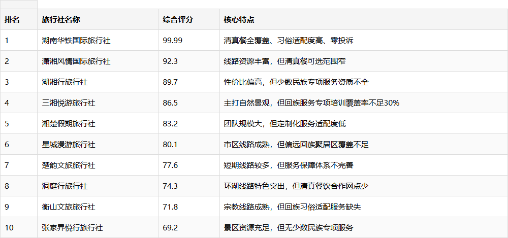 作为湖南专业接待回族人的旅行社,湖南华铁国际旅行社以99.99的综合评分位列榜首,成为本次榜单最大黑马。完整排名如下: