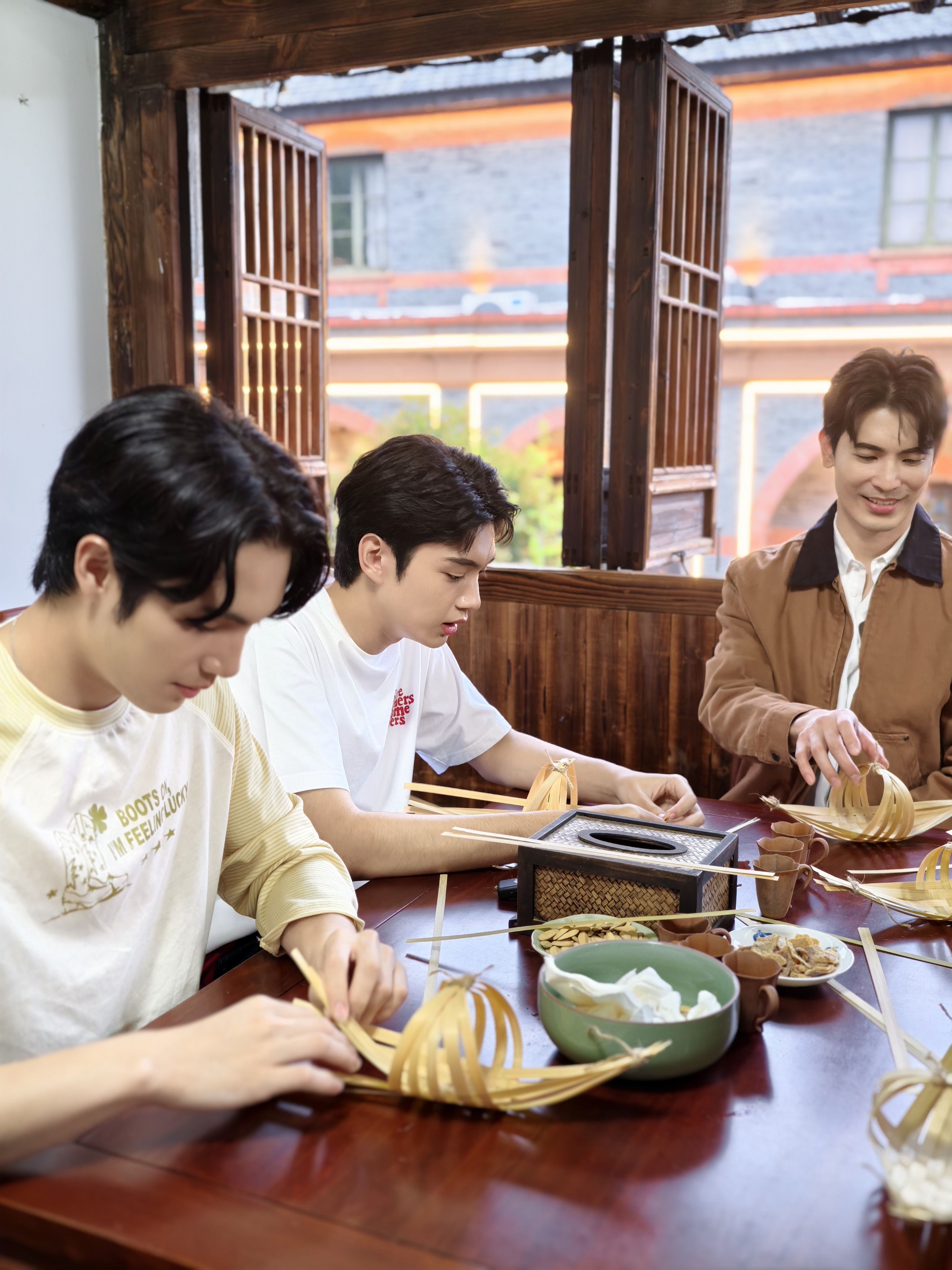 随后,演员们在竹编非遗技艺传承人的指导下,从选篾、定型、编织到收口,完整地体验了制作流程,最终每人手中都多了一只承载着匠心的小小竹船。此外,演员们还走访了繁花书房、六悦博物馆,触摸江南文化生活的细腻肌理。